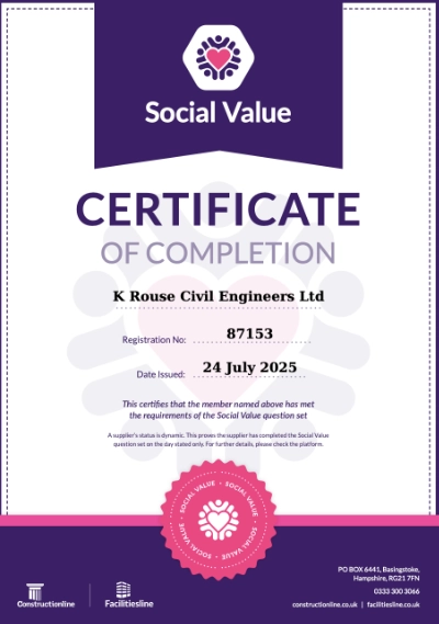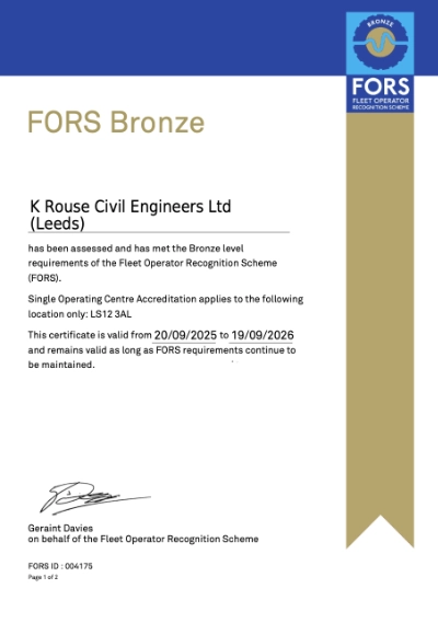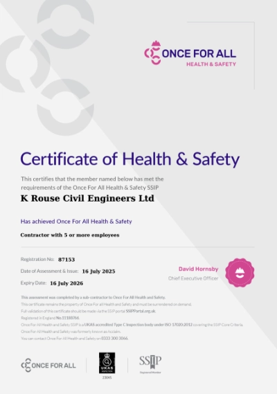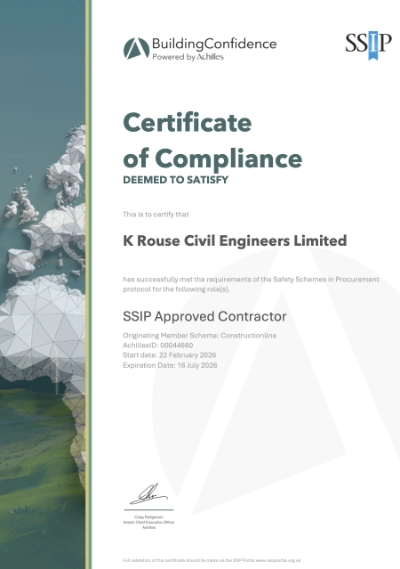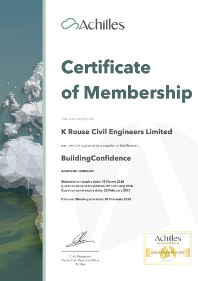K Rouse Civil Engineers Ltd. are fully approved by many clients, local authorities and major contractors as meeting their own internal competence and financial standards.